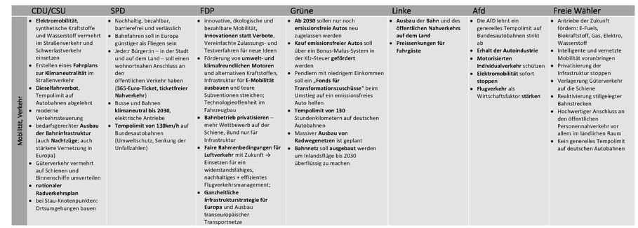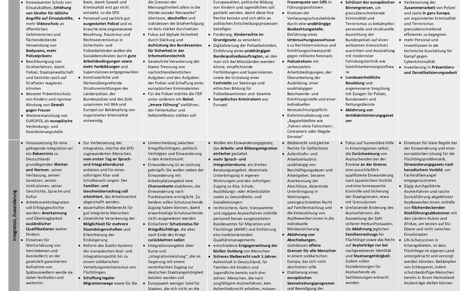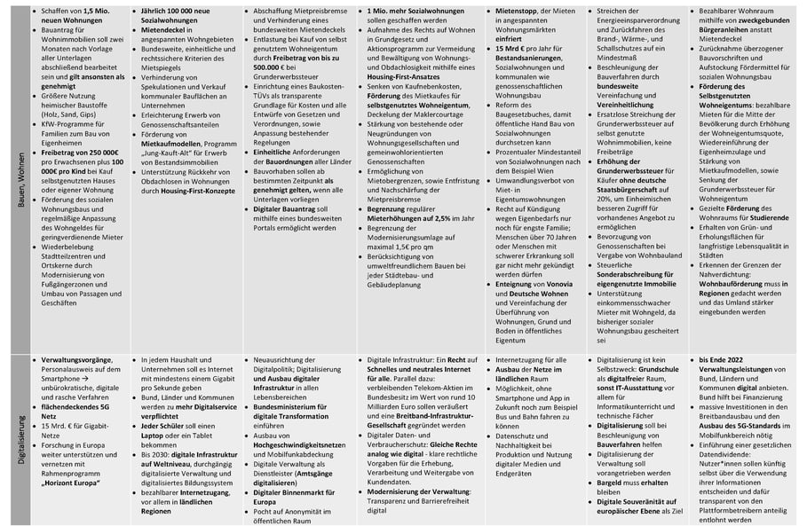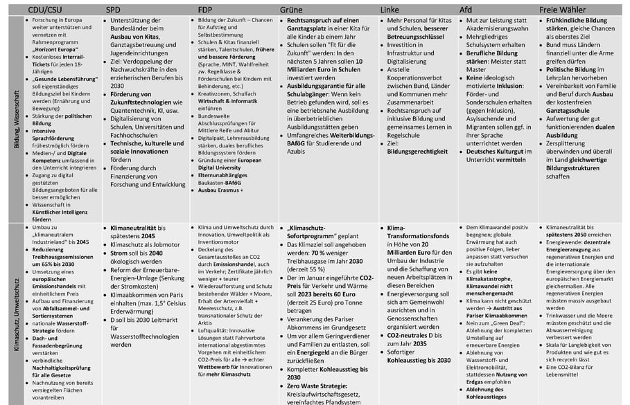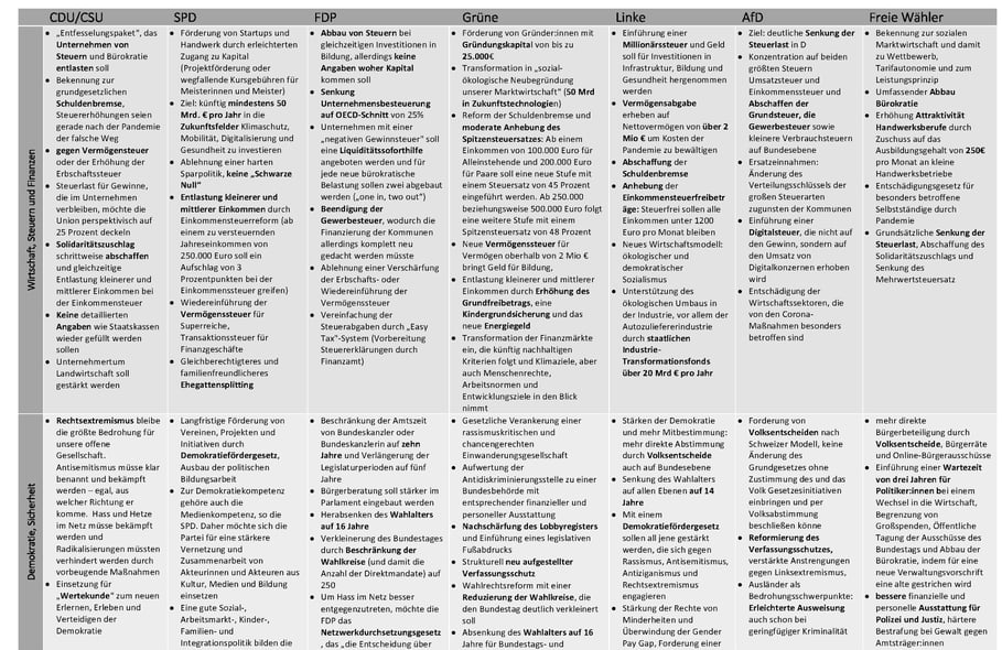 - Wahlthemen der Parteien im Vergleich Bundestagswahl 2021 (Landeszentrale für Politische Bildung Baden Württemberg)